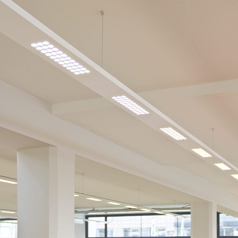 One of the key features of the Myos‑MOS Multioptic® Suspension System is the application of Multioptic® lens technology. This advanced optical technology allows for the selection of the most suitable beam for every space and application. Whether it concerns precise task lighting, subtle indirect light, or a combination of both: Multioptic® ensures highly controlled and efficient light distribution. This delivers light exactly where it is needed while minimizing glare and unnecessary light spill.