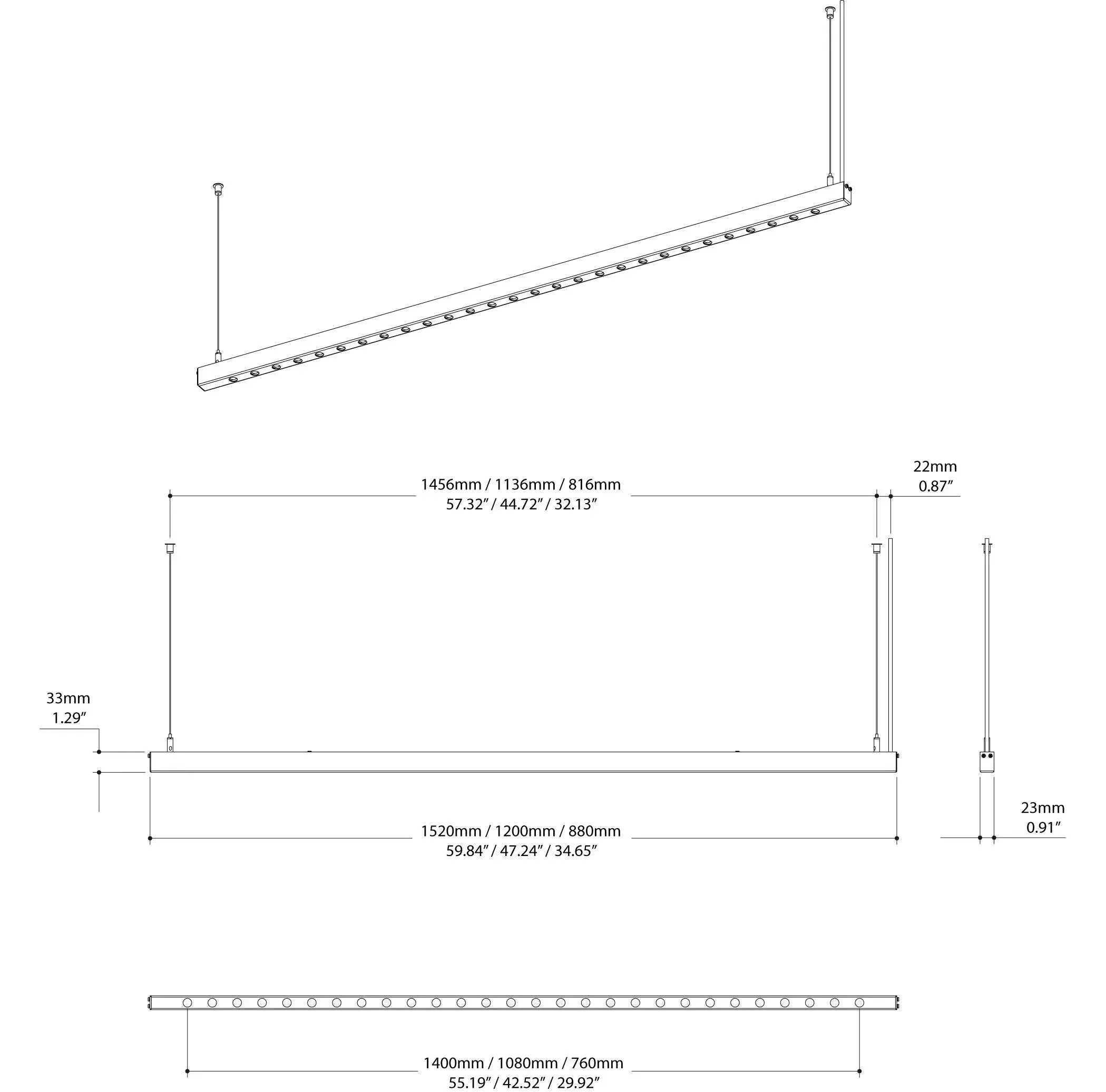 Sirio-S, verkrijgbaar in drie lengtes 880, 1200 en 1520 mm, wordt standaard geleverd met een netsnoer van 3 meter en ophanging met staaldraad.